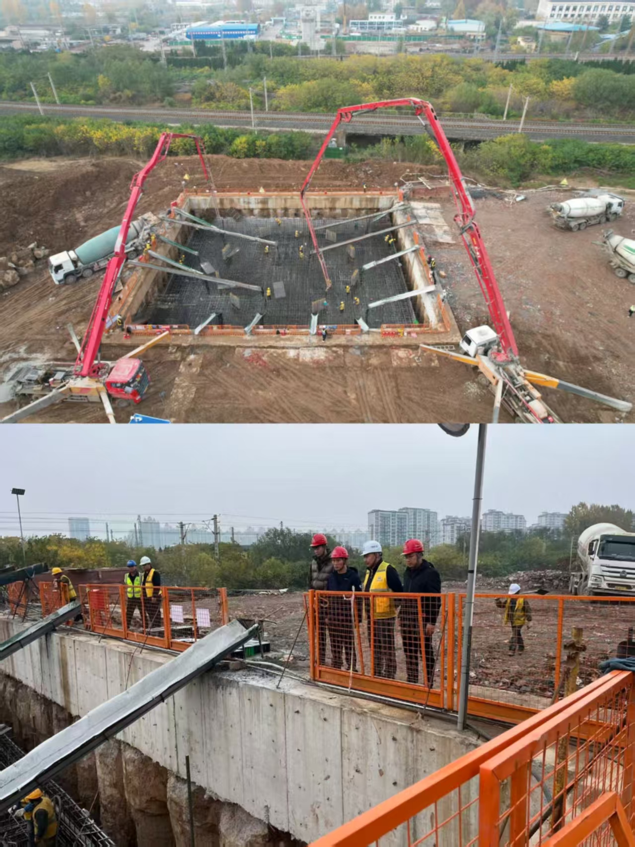 近日,济南市开源路(工业北路至涵源大街)道路建设工程上跨铁路桥迎来关键控制节点——胶济客专南侧15#主墩下承台大体积混凝土浇筑顺利完成。作为转体桥的“受力根基”,该下承台不仅能将未来桥体的巨大荷载安全传递至地下桩基,更直接承载着让桥梁实现“空中转身”的转盘支座,是实现桥体精准转体的根本保障。本次浇筑混凝土方量达4249m³,历时30余小时连续浇筑作业,运用分层浇筑、循环水冷却、智能温控等技术,有效保障了这座“超级底盘”的施工质量。此举标志着主桥全面进入了转体桥主墩转盘结构施工新周期。