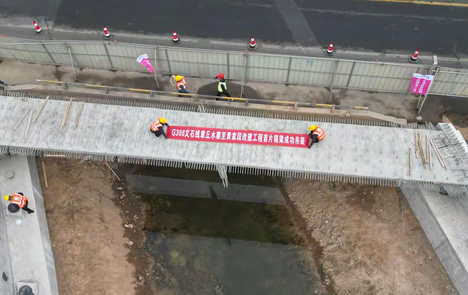 G308文石线章丘水寨至黄家段改建工程首片箱梁成功吊装