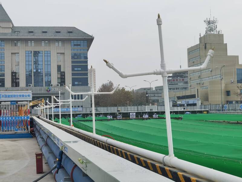 在地铁4号线凤凰路站、浆水泉站、泉城公园站等6座处在人流密集区域的车站,全封闭施工罩棚将施工现场变为“室内作业”。钢罩棚侧墙采用双层镀锌压型板材,内嵌隔音棉,屋面采用轻型屋面,将噪声污染降到最低;通过内装高压喷雾降尘系统,达到降尘、降温效果,不仅解决了扬尘污染问题,更极大改善了工人们作业环境。